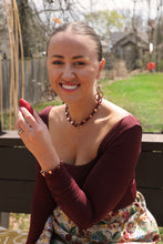 Warm and earthy, Red Girl Rising is a gorgeous combo inspired by Mohawk educator and community leader Joyce Crone. Red Girl Rising features rich deep red oyster shell, warm brown glass pearls and stunning rose gold chain. Endless combinations await!