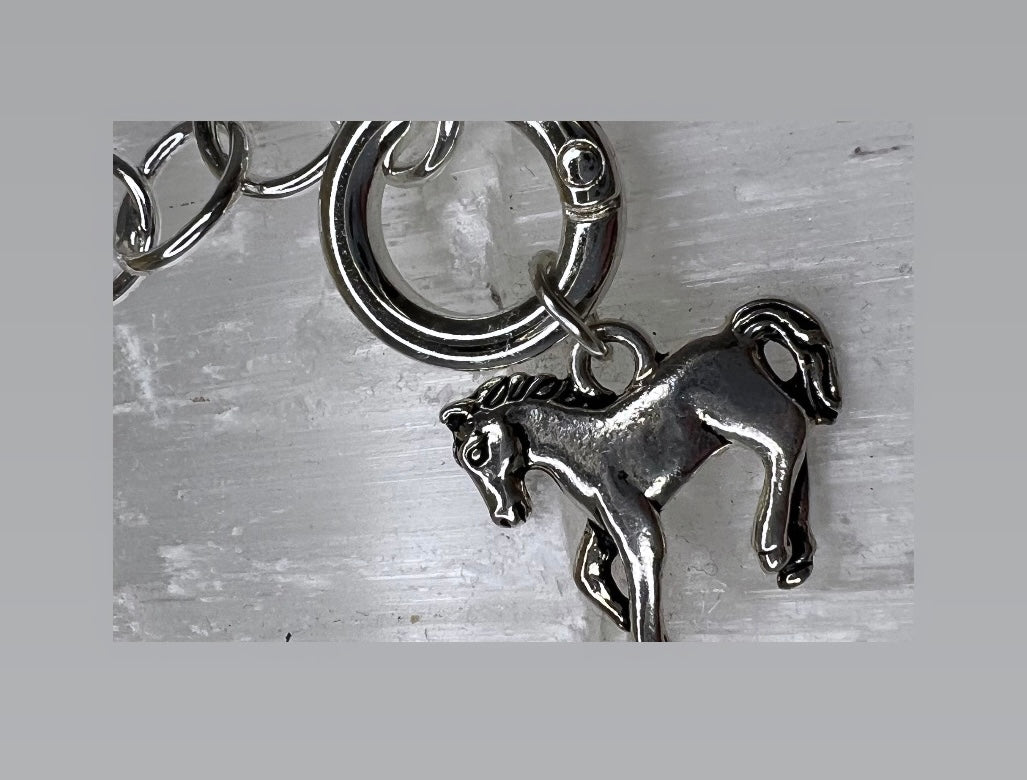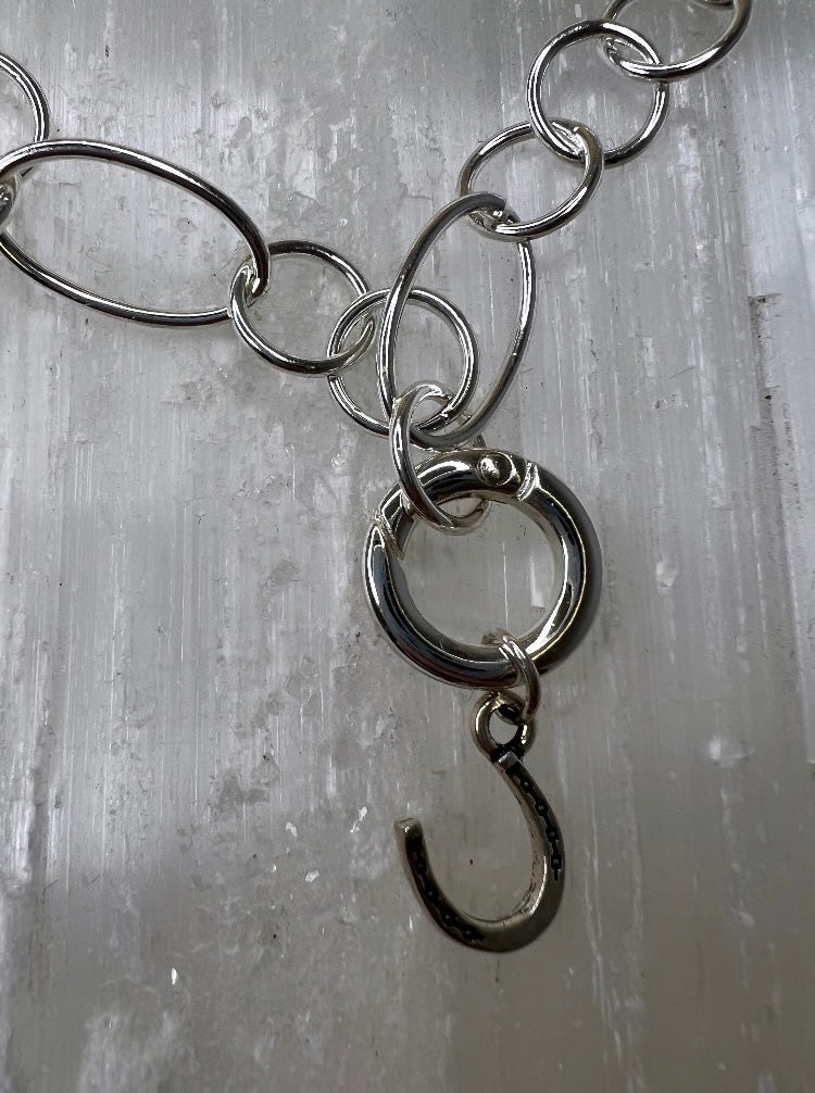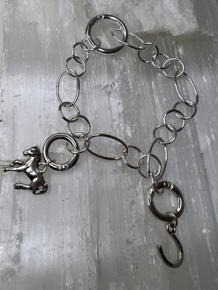 Light, delicate silver chain made of ovals mixed with circles add a gentle layer to your arm party. Including clasp, this bracelet is 9" long. Clip anywhere on the chain to fit your wrist! This beauty comes with 2 attachable  sterling-plated charms- Lucky Horseshoe and Horse.